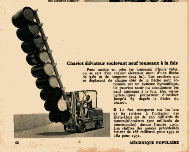 Charriot élévateur soulevant neuf tonneaux à la fois