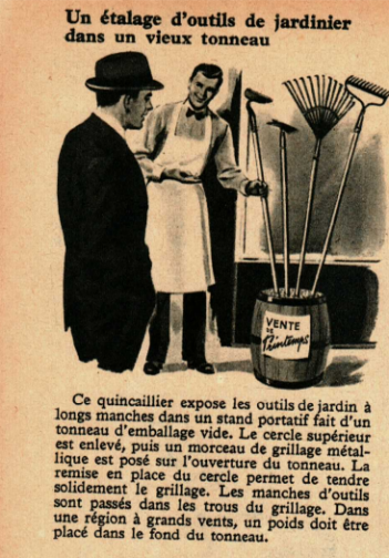 Un étalage d’outils de jardinier dans un vieux tonneau