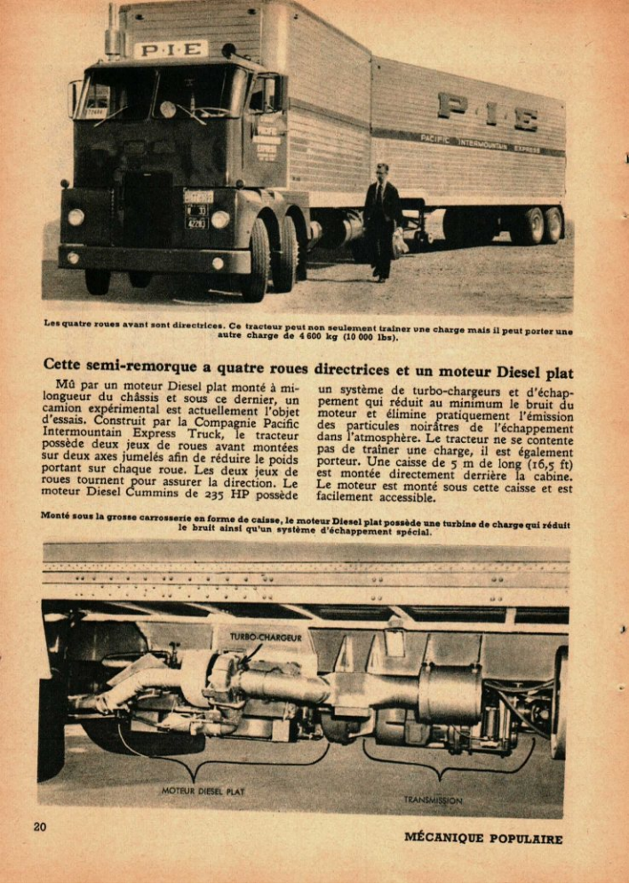 Cette semi-remorque a quatre roues directrices et un moteur Diesel plat