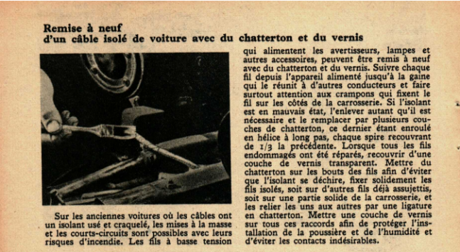 Remise à neuf d’un câble isolé de voiture avec du chatterton et du vernis